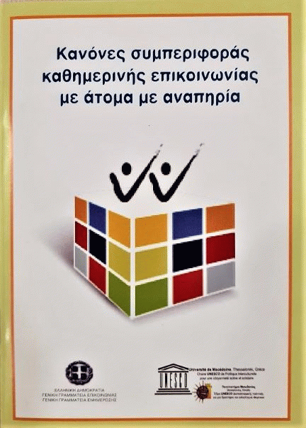 Η Γενική Γραμματεία Επικοινωνίας - Γενική Γραμματεία Ενημέρωσης, ανταποκρινόμενη στο αίτημα της έδρας της UNESCO του Πανεπιστημίου Μακεδονίας, προχώρησε στην έκδοση αυτού του σύντομου οδηγού στην ελληνική γλώσσα. Περιέχει δεκαοκτώ κανόνες συμπεριφοράς καθημερινής επικοινωνία με άτομα με αναπηρία. Το κείμενο αποτελεί μετάφραση από τα αγγλικά της αντίστοιχης έκδοσης της Κροατικής Συνομοσπονδίας Ατόμων με Αναπηρία. Η ορθότητα των όρων που χρησιμοποιούνται έχει ελεγχθεί από την Εθνική Συνομοσπονδία Ατόμων με Αναπηρία (ΕΣΑμεΑ).